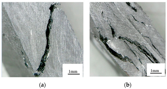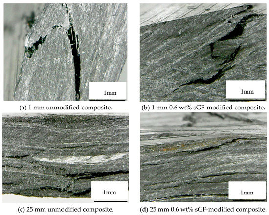 Images of the fractured region of 1 and 25 mm composites after the test taken by the digital microscope are shown in Figure 12. In 1 mm composite, the cracks appeared in the thickness direction. By contrast, cracks propagated in longitudinal (inter-laminar) direction in the 25 mm composite. These results suggest that the cracks propagated through CF tips in the 1 mm composite, but along the fiber in the longer fiber composite.