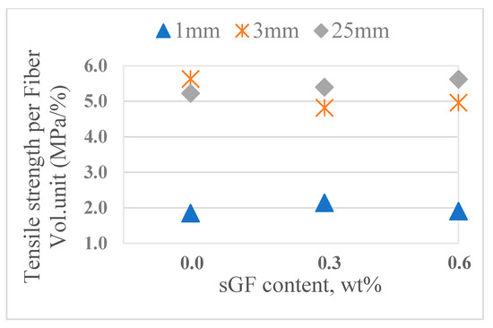 The same tendency with the flexural strength can be noticed in the tensile strength (Table 3 and Figure 13). For the same volume fraction of fiber, 3 mm composite and 25 mm composite also had similar tensile performance. Table 4 compares flexural and tensile strength of un-modified composites at different lengths (i.e., 1 mm, 2 mm, 3mm, and 25 mm). The results suggest that 3 mm can be considered as the “critical fiber length” of the composite in this research. Adding CF 1 mm into matrix at 25% fiber volume fraction significantly reduced the tensile strength of resin. The tensile strength of this composite fell to approximately 63% compared to that of neat resin. The addition of sGF could not compensate for this degradation, as the longitudinal tensile strength of composite materials is determined mostly by the strength and volume content of the fiber reinforcement [26].