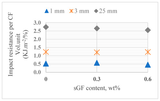 Mechanical performance of short fiber composite often varies in a large range because of experimental scatter causing difficulties in predicting the effect of modifiers on filled-system [5]. Values in parentheses manifested large standard deviation of tested data of mechanical properties of composites (for example, see Table 2, Table 3). Table 2 and Figure 7 show the change of flexural strength of composites with respect to CF length corresponding to sGF content. The flexural strength of composites increased with an increase of CF length, as mentioned by Thomason [24]. However, the significant improvement of bending strength only happened when the fiber length changed from 1 to 3 mm. In the other words, the bending strength per fiber volume fraction of 3 and 25 mm composite was almost the same.