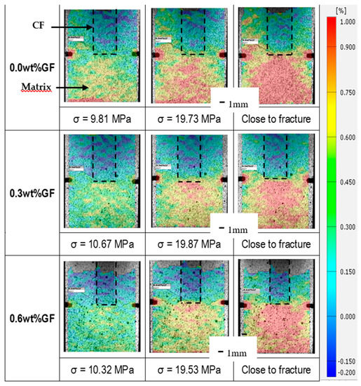 Figure 16 shows the strain distribution along the longitudinal direction of model composites under the same level of tensile load. In this figure, the position of embedded carbon fiber bundle is illustrated in black dash lines. The test results indicated that the strain around the carbon fiber bundle tip and pre-crack increased with the increase of applied stress level. However, when the matrix was modified with sGF, the strain concentration was suppressed. These results suggest that the existence of added sGF is helpful in avoiding stress concentration at the carbon fiber tip.