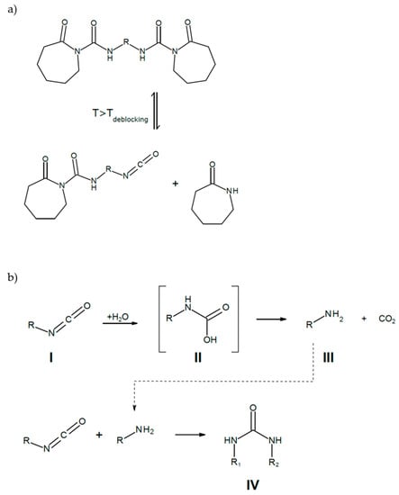 Above Tdeblocking (see Figure 2b), the highly reactive isocyanate group (I) reacts with the water molecule to form an unstable carbamic acid (II), which decomposes into a primary diamine (III) and carbon dioxide. Furthermore, a second reaction step is possible. Another isocyanate group can react with the diamine to build a substituted urea (IV). The reaction shows a stoichiometric ratio of 1:2, i.e., one water molecule is able to deactivate two activator molecules.