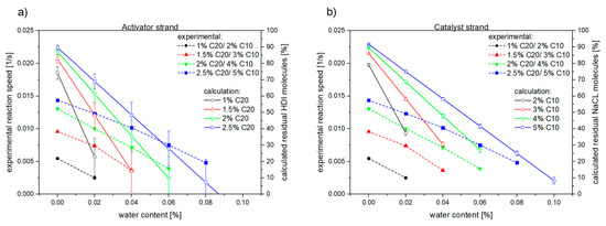 Based on the reactions shown in Figure 2 and Figure 3, different ratios of reactive and deactivated activator and catalyst molecules are possible. If only the first reaction step will appear, a ratio of 1:1 will result. If further reactions take place, the ratio will be 1:2 (one water molecule deactivates two reactive molecules), or even 2:1. Considering the given concentration range of NaCL in C10 and HDI in C20 from the TDS and MSDS, a second unknown constant arises. For the calculation of the amount of water, an average value of NaCL and HDI was taken. The average value for NaCL in C10 was set to 18% (17–19% given in TDS [30]) and the average value for HDI in C20 was set to 85% (70–100% given in the MSDS [31]).