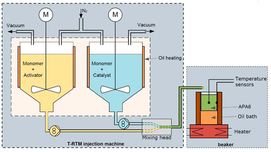 Schematic setup of low pressure T-RTM injection machine and beaker for the kinetic tests.