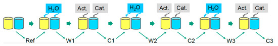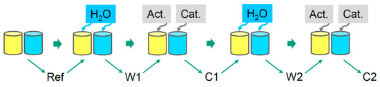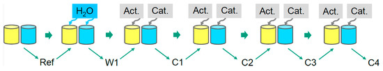 In order to validate the theoretical assumptions of Section 3, all four formulations (F1–F4) were examined. The 1:2 molar ratio of activator/catalyst determined in the previous experiments for compensation of water was applied. Water was added to each formulation twice (W1, W2) and then its effects were compensated twice (C1, C2). The procedure of water addition and subsequent compensation is shown in Figure 11.