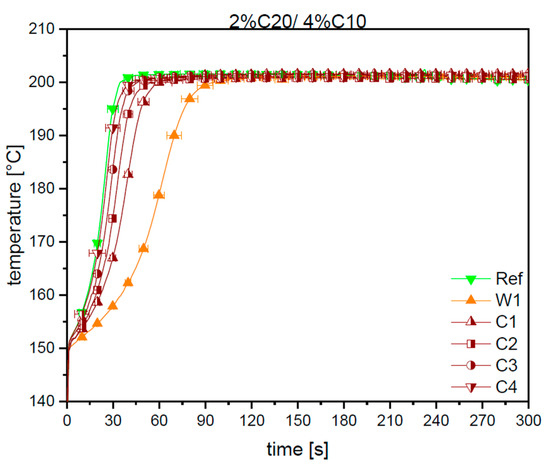 For formulation F3 (2% C20/4% C10), the amounts of activator and catalyst for compensation were added in ratio 1:1 (C1), 1:1.33 (C2), 1:1.67 (C3) and 1:2 (C4) compared to water (Figure 9). The aim was to achieve the reaction/polymerization rate of the reference. This was realized with C4, which is identical to the reference. Thus, it is assumed that C4 fully compensated the added water and the initial polymerization rate was restored.
