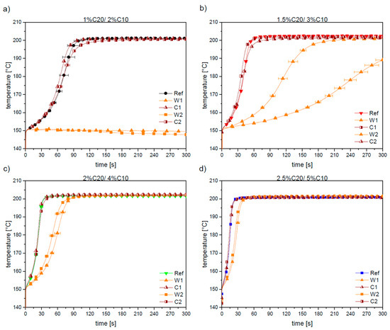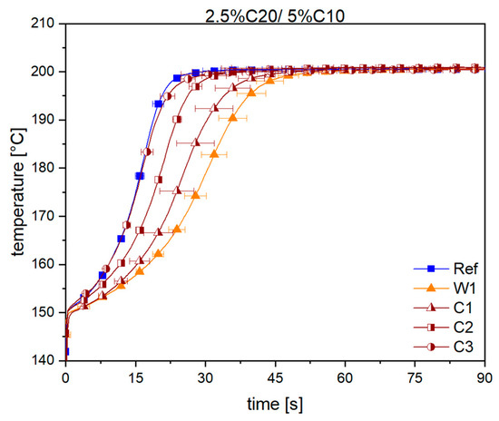 Figure 12 shows the compensation series of the four formulations (F1–F4). Generally, the time to reach the maximum temperature decreases at higher C10 and C20 content due to the increased polymerization speed.