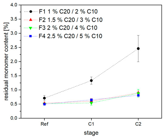 The residual monomer content for all formulations except F1 remains below 1%. The residual monomer content increases for all formulations. The largest increase in monomer content can be seen at F1. Here, again, the sensitivity shows up due to the small number of reactive molecules. From this result, it can be concluded that the deactivation of the reactive components with water, and the compensation for the influence of water, results in poorer polymerization. In addition, the residual monomer content decreases with increasing activator and catalyst concentration.
