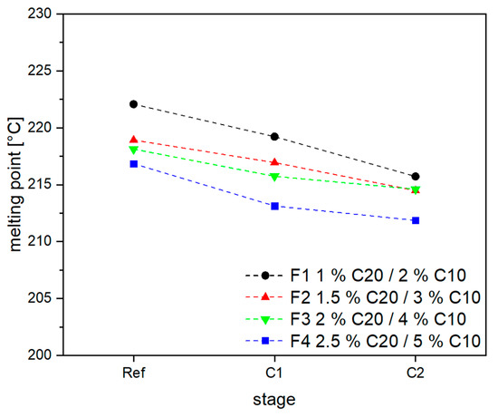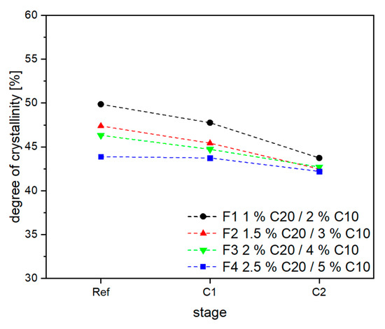 Figure 14 shows the degree of crystallinity for the four investigated formulations. For each compensation step, the crystallinity degree decreases for all four formulations. Similar to this trend, the melting points (see Figure 15) also decrease. The different degree of crystallinity between the references can be explained by the fact that it depends on the concentration of activator and catalyst. An increased amount of activator and catalyst leads to lower crystallinity values for all formulations. This can be explained by the increasing molecular weight and the lower reaction rate at low activator and catalyst concentrations. Due to the slower reaction rate during polymerization, more time is available for the formation of crystalline structures, and the mobility of the chains is increased.