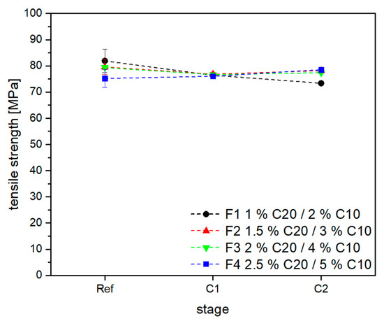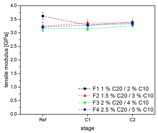 Figure 16 shows the tensile modulus of the neat APA6 reference samples and after two compensations (C1, C2). The specimens show a fairly constant behavior along compensation C1 and C2. The tensile modulus of F2 and F4 increases slightly from 3.2 GPa to 3.4 GPa, and F3 is slightly below the values of the other three formulations. In former investigations, tensile moduli of 2.6–3.2 GPa were achieved [8].