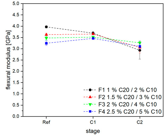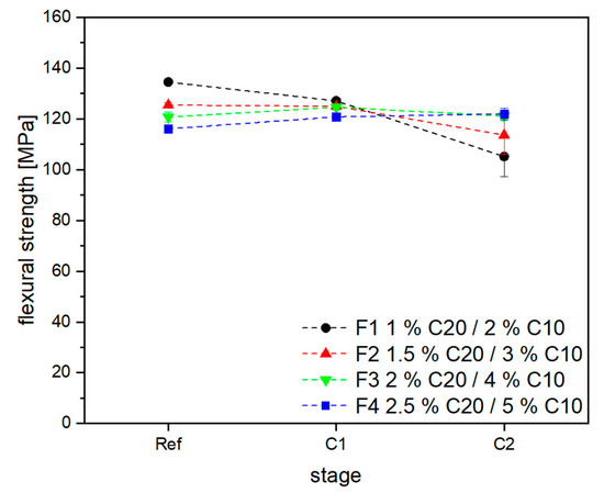 The flexural strength is shown in Figure 19 and for F1, the compensation stages lead to a strength reduction of approx. 22% (Ref. to C2). F2 decreases by 10%, while F3 and F4 increase by 3% and 5% respectively. However, since the deviation of the values for F2–F4 is only very small, it can be stated for these formulations that the compensation does not have a significant effect on the bending strength. The strength of the compensation of F1 shows the largest decrease compared to the reference because F1 has the lowest number of reactive molecules and is, therefore, the most sensitive.