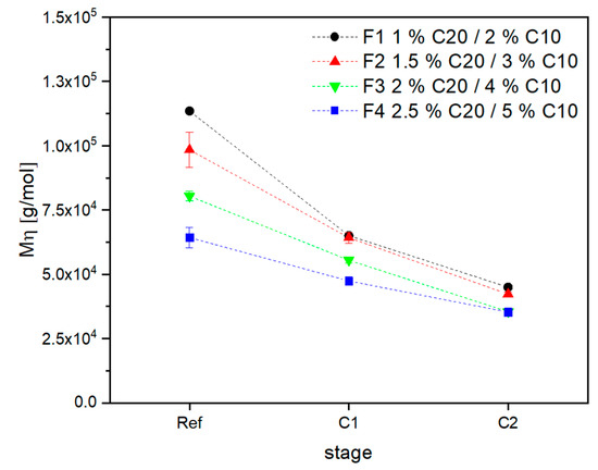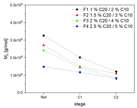 The number average molecular weight (see Figure 22) shows the same trend and the obtained values are reduced by 45–64% between the reference and C2. Compared to the viscosimetry average molecular weight Mη, the values of Mn are significantly higher, since the unreacted residual monomers did not affect the measurement.