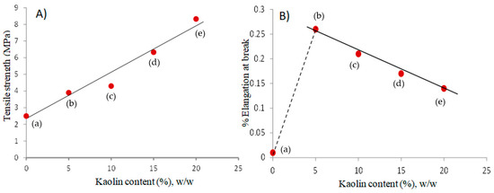 As the film thickness (200 µm) and maximum force (15 N) exerted onto the films were unchanged, the experiment was run to measure the ability of a film to withstand a longitudinal stress, which was expressed as the greatest stress that the film can stand without breaking. Figure 1A shows a relation between the tensile strength of the self-assembled nanocomposite film and the variable content of kaolin. The zero kaolin content film, K0SNC, gave a tensile strength of 2.5 MPa, whereas the maximum tensile strength (8.33 MPa) was found from the K20SNC film. The overall trend of the line is straight with a positive slope, which indicates that the tensile strength increases with the increase of the amount of kaolin [24]. At 10% w/w, there was an experimental error or the film K10SNC was not perfectly prepared (it may be that the film was not homogeneous); therefore, the value obtained (4.3 MPa) was slightly lower than that of the average values of the trend line. The explanation for this effect is ascribed to the formation of a rigid network of nanofillers, the mutual interaction and entanglement between the nanofillers (kaolin), and the starch matrix [25]. The efficient stress that arose from the starch to kaolin occurred due to the negative free energy development during the self-assembly of kaolin. This phenomenon was supported by the research group of Mathew et al. in 2002, where they proposed an increase in the overall crystallinity of the system; as a result, the nucleating effect in the composite can be beneficial for mechanical properties [26].
