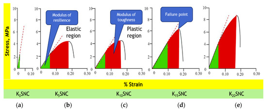 Effect of kaolin content on the modulus of resilience and modulus of toughness of the nanocomposite films produced from (a) K0SNC, (b) K5SNC, (c) K10SNC, (d) K15SNC, and (e) K20SNC films.