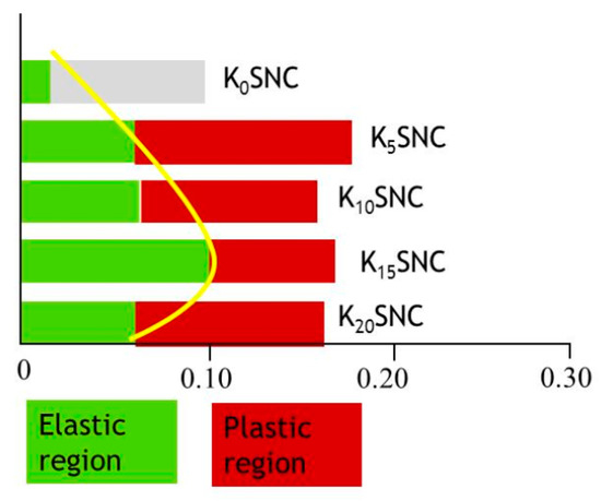 In Figure 2, stress (MPa) versus percentage strain was plotted and the effect of kaolin on the elastic and plastic behaviors was depicted. K0SNC shows only the modulus of resilience, which is represented with the green zone, but when the kaolin was added with the starch, then the film showed dual characteristics, including plastic behavior. It indicates that kaolinite reinforced to incorporate the brittle nature of the film. Interestingly, with the variation of kaolin content from 5% to 20% w/w in the film, the change of rheology in terms of the elastic and plastic characteristics are explained more clearly from Figure 3. It is evident that the maximum modulus of resilience was found for K15SNC film, which is about 5 times higher than that of K0SNC film. This could be because the distribution of kaolin in the self-assembled film was homogeneous and perfectly proportionate. Besides, initially, the maximum plastic region was found for the film-produced K5SNC materials, which decreased in the case of theK15SNC film and further increased for the K20SNC film. In the K20SNC film, kaolin nanoparticles agglomerations were found, and the modulus of resilience result was lower than that of the other composites. This can be easily explained: 20% w/w kaolin content film suffered from agglomeration and a lack of sufficient starch matrix to carry out the flow properties of the film.