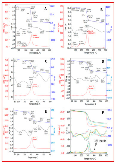 Table 1 shows a summary of thermogravimetric analysis for five samples—K0SNC, K5SNC, K10SNC, K15SNC, and K20SNC—in terms of onset temperature, temperature at which decomposition was completed, the amount of composite decomposed in percentage, the type of reaction occurred, and the temperature at which the maximum decomposition rate recorded. It is clear from the onset temperatures envisaged in Table 1 that after the addition of 5% kaolin, the change of temperature was significant, i.e., 9 °C was increased, whereas from 5% to 20%, the increase of kaolin lead to 5 °C more tolerance at 284 °C for onset decomposition. This phenomenon indicates that kaolin plays a crucial role in stabilizing the composites against temperature. The films without kaolin decomposed completely at 334 °C, but except for K5SNC and K15SNC, all the other films showed only slightly higher temperatures. However, it was not remarkably high compared to K0SNC film. The decomposition amount from K0SNC to K20SNC films within the temperature range from onset to complete decomposition gradually decreased from 76% to 54%. It is noticed from the data that there is an inverse relationship between decomposition quantity and kaolin content. As the content of kaolin increased in the composite films, the amount of decomposition was decreased, since the residue was gradually increased. The reactions involved with the whole temperature profile from 30 to 600 °C are endothermic and exothermic due to heat absorption by moisture and the starch biopolymer and the later desorption of heat that occurs by the burning of starch for char formation. Interestingly, it is found that the rate of decomposition was increased with the increase of kaolin content in the films. At 290 °C, the rate of maximum decomposition (Rmax) was 17 μg/°C for K0SNC film. A slightly higher decomposition rate, 22 μg/°C, was found for the K5SNC and K10SNC films at 300 °C and 312 °C. Besides, the K15SNC film showeda drastically increased decomposition rate of 30 μg/°C at 314°C, which is lower than that obtained from K20SNC, Rmax = 36 μg/°C, at Tpeak = 316 °C, indicating that the K20SNC film is more thermally unstable that the K15SNC film [27,28,29,30,31,32,33,34,35,36].