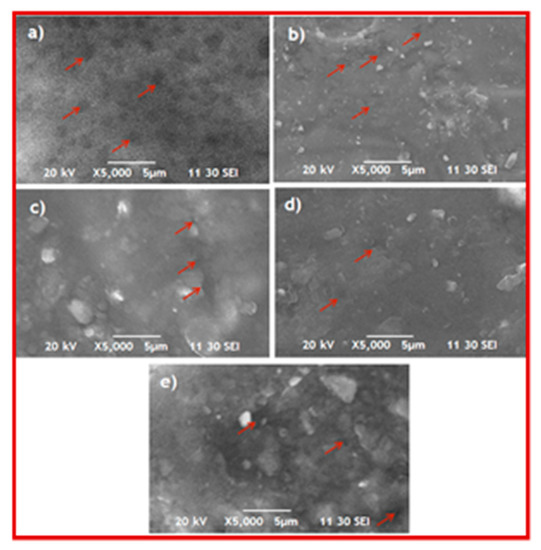 The morphological structures of the composite films were investigated using SEM. In Figure 6, SEM images are inserted, and Figure 6a represents the image of film produced without kaolin. The arrow indicates the dark spot of the film where a porous structure was found. The pore was distributed almost homogeneously in the film. The porosity was decreased after the addition of kaolin, as shown in Figure 6b–d. The least number of pores were observed from the K15SNC film, indicating the homogeneous distribution of kaolin in the film. Besides, the surface of the K20SNC film looks rough due to the agglomeration of excess kaolin, which is depicted in Figure 6e.