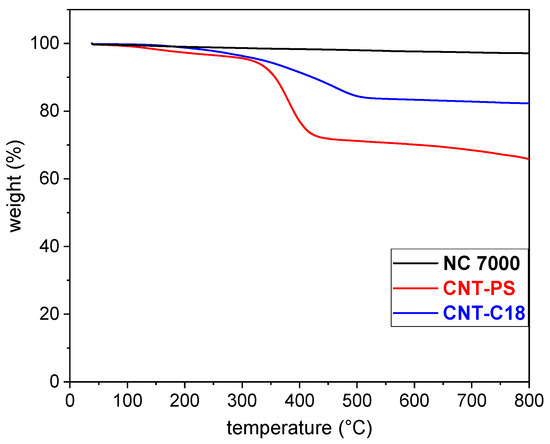 Thermogravimetric analysis (TGA)-curves of MWCNTs NC 7000, CNT-C18, and CNT-PS.