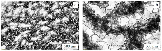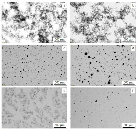 MWCNTs of type NC 7000 from Nanocyl have been shown to disperse well in various polymer matrices and also in aqueous surfactants [33] and organic solvents [34] and were therefore selected for this study. 1 wt % of MWCNTs were first dispersed in the pure homopolymers and in macrophase-separated PS/PB blends. In Figure 2a,b TLM images of thin films prepared on glass substrates were presented, visualizing the macrodispersion of NC 7000 in PS and in PB films made from toluene. The MWCNTs form a fluffy agglomerate network in the PS and in the PB matrix, which results from the re-agglomeration of the dispersed CNTs during evaporation of the solvent [34] and indicate a poor stability of the CNT-dispersion in the polymer solution. This process is also called secondary agglomeration and was described by Alig et al. as a process that takes place in quiescent melt or under shear deformation [35]. Similar results were found in films made from chloroform (not shown here).
