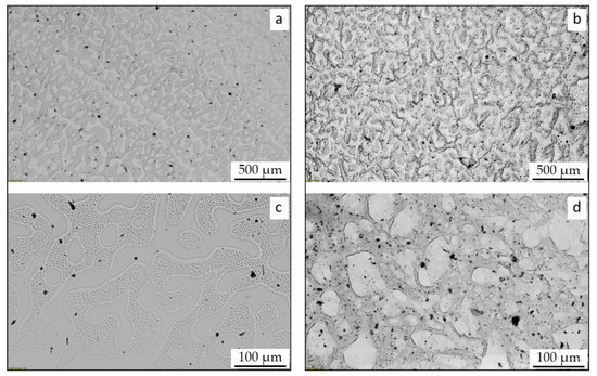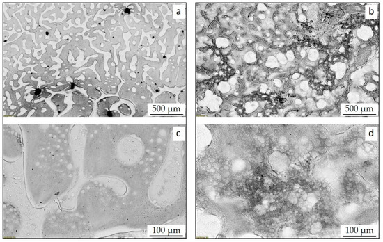 TLM images of PS/PB blends with 1 wt % of CNT-PS dispersed in toluene (a,c) and chloroform (b,d) prepared on glass substrates; (c,d) at higher magnification.