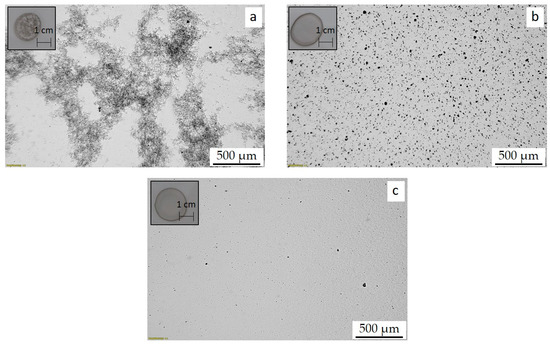Films of BCP/MWCNT composites were prepared using the solvent toluene. Light microscopy images captured in transmission mode of composites containing 1 wt % of MWCNTs evaporated on glass substrates are shown in Figure 8. Photographs of the films are presented in the inserted images of Figure 8. The thickness of the films is about 30 µm. Similar to the CNT dispersion in homopolymers and blends the unmodified NC 7000 form a cloudy-like network structure in the 3G55 starblock copolymer caused by secondary agglomeration during evaporation (Figure 8a). In contrast, the CNT dispersion is strongly improved by the addition of modified CNTs (Figure 8b,c), whereby CNT-PS exhibit compact primary agglomerates that are homogeneously distributed in the matrix (Figure 8b). Nevertheless, the film is very transparent and the larger agglomerates are visible as black dots. Composite films with CNT-C18 are almost free of agglomerates and exhibit very good transparency (Figure 8c).
