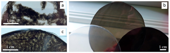 Photographs of BCP/MWCNT composite films: (a) 0.1 wt % NC 7000, (b) matrix 3G55, 0.1 wt % CNT-PS and 1 wt % CNT-PS (from left to right), (c) 0.1 wt % CNT-C18.