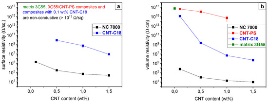 Surface resistivity and volume resistivity of the BCP/MWCNT composites as a function of CNT content are displayed in Figure 11a,b, respectively. Composites containing NC 7000 are electrically conductive already at a very-low MWCNT content of 0.1 wt %, exhibiting surface and volume resistivity values of 2 × 105 Ω/sq. and 6 × 104 Ω∙cm, respectively. With increase of the MWCNT content up to 1.5 wt % the resistivity values further decrease to 240 Ω/sq. and 10 Ω∙cm, respectively. Similar to the results of the investigated PS/PB blends, BCP composites containing functionalized CNT-PS are non-conductive in the investigated range of CNT contents up to 1 wt %. In contrast, BCP composites containing functionalized CNT-C18 exhibit a percolation threshold approximately at a CNT content of 0.5 wt %, which is expressed in a significant drop in resistivity in this range. However, with further increase of the CNT content up to 1.5 wt % the resistivity maintains at a rather higher level, exhibiting values of 8 × 106 Ω/sq. and 5 × 105 Ω∙cm for surface and volume resistivity, respectively. The results of the resistivity measurements correlate very well with the observed CNT dispersion in the films examined. As already discussed in the literature [9,35], very good CNT dispersion tends to hinder the formation of a conductive CNT network within the matrix and requires higher filler contents. In contrast, a mixture of very-well-dispersed CNTs and agglomerated CNTs promotes percolation of the CNTs and leads to high electrical conductivity.