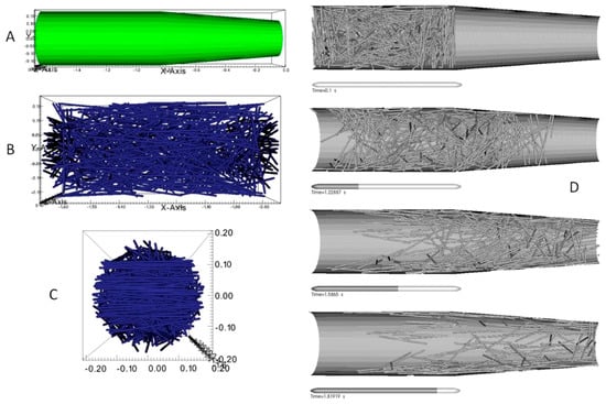 High resolution numerical simulation of a carbon fiber loaded ink under conditions of microextrusion during a direct ink writing (DIW) printing process to form an additively manufactured carbon-fiber-reinforced composite (AMCFRC). (A) represents the total computational domain for these simulations which cylindrical/conical volume, terminating in a 400-μm orifice and is representative of the last 2 mm of the actual extrusion head. (B,C) are the side and end views showing the initial (random) fiber partial distributions within the contiguous phase. (D) represents the time-resolved evolution of the fiber orientations in 3D within the computational domain under the simulated conditions of printing. Note that the simulation predicts what appears to be a wall dominated shear alignment process that follows closely the predicted velocity profile of the fluid. Reprinted from [23], © 2017, with permission from Springer Nature.
