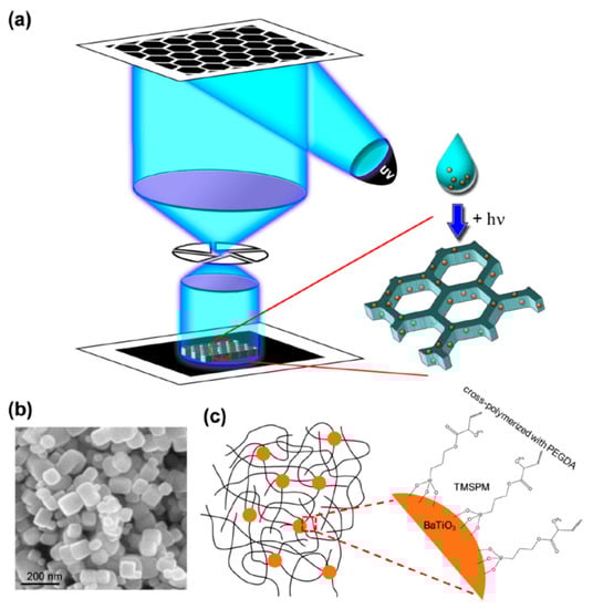 Sirbuly et al. incorporated barium titanate (BaTiO3, BTO) nanoparticles into photoliable polymer solutions and, after exposition to digital optical masks, generated user-defined 3D microstructures [35], demonstrating the feasibility of the 3D optically printing of piezoelectric nanoparticle-polymer composites using digital projection printing. They provided a tool for fabricating 3D piezoelectric polymers and indicated the route for creating highly efficient piezoelectric polymer materials via nanointerfacial tuning. In fact, the nanoparticles’ chemical modification, by using acrylate surface groups forming covalent bonds with the matrix under light exposure, led to an increase in the mechanical-to-electrical conversion efficiency of the composites. A grafting of the nanoparticles to the polymer backbones occurred, due to the crosslink of the matrix with the piezoelectric nanoparticles, enhancing the piezoelectric output of the composites by efficiently funneling mechanical stress to the crystals, thanks to the direct linkage with the flexible polymer matrix (Figure 7).