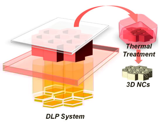 Chiappone et al., since the particles’ inclusion in the matrix could be making the printing process more difficult, proposed an in situ generation of nanoparticles after the printing process [36,37]. The 3D structures were fabricated by embedding Silver nitrate in a mixture of polyethylene glycol diacrylate (PEGDA) oligomer and a photoinitiator, and then exposing to a Digital Light Processing (DLP) system. Once fabricated, the material was thermal treated to induce the in situ generation of metal nanoparticles (NPs) in the matrix (Figure 8).