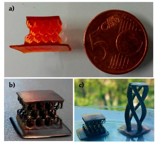 Three-dimensional objects produced by the DLP technique from the formulation containing polyethylene glycol diacrylate (PEGDA) and 15 phr of silver nitrate. (a) Honeycomb structure, as printed; (b,c) samples after the thermal treatments; the metallic aspect induced by the presence of the silver nanoparticles is clearly visible. Reprinted from [37], © 2016, with permission from MDPI AG.