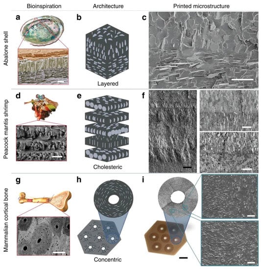 Bioinspired composites with microstructured architectures can be recreated with 3D magnetic printing. (a) The Haliotidae sp. Abalone shell exhibits a layered structure of calcite prisms topping in-plane aragonite platelets (nacre). This architecture is (b) simplified and (c) 3D magnetic printed. (d) The dactyl club of the peacock mantis shrimp exhibits a cholesteric architecture of mineralized chitin fibres. This architecture is (e) simplified and (f) 3D magnetic printed. (g) The mammalian cortical bone exhibits concentric plywood structures of lamellae-reinforced osteons. This architecture is (h) simplified and (i) 3D magnetic printed. All printed microstructures are acrylateurethane co-polymers reinforced by 15 volume percent alumina platelets. Scale bar: 5 mm in (a); 25 mm in (c); 15 mm in (d); 50 mm (black) and 20 mm (white) in (f); 200 mm in (g); and 5mm (black) and 25 mm (white) in (i). Reprinted from [38], © 2015, with permission from Springer Nature.