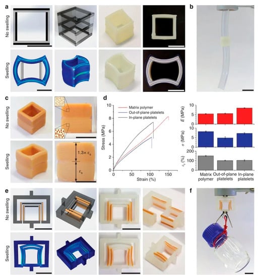 Soft mechanical fasteners fabricated through the programmable MM-3D printing of shape-changing objects. (a; Top) Drawings and actual printed cuboids before the shape change. This part is named cuboid 1. (a; Bottom) Finite element simulations and actual pictures of the cuboids after the shape change. At the bottom right, the simulated cross-section of the cuboid is superimposed on a picture of the actual part to illustrate the good agreement between experimental and predicted curvatures. Scale bars, 10 mm. (b) Cuboid-mediated fastening of two tubes achieved through the shape change of the printed object. Scale bar, 20 mm. (c) Cuboid object with same architecture as in a but containing anisotropic platelets magnetically aligned in different orientations within the soft phase. This part is named cuboid 2. The platelets are aligned horizontally in the top, darker half and vertically in the bottom, brighter half. Scale bar, 10 mm. εs is the swelling strain. (d, Left) Representative stress–strain curves of printed materials comprising the soft phase reinforced with platelets aligned in different orientations. (d, Right) Elastic modulus (E), strength (σ) and strain-at-rupture (εr) of the printed materials with different textures. Error bars show s.d. (n = 5). (e, Top) Drawings and actual printed key–lock objects before the shape change. (e; Bottom) Finite element simulations and actual pictures of the key–lock structure after the shape change. Scale bars, 15 mm. (f) Mechanical fastening enabled by the shape changing key–lock architecture. Scale bar, 15 mm. In all drawings, light and dark grey colours indicate soft and hard phases, respectively. Reprinted from [39], © 2015, with permission from Springer Nature.