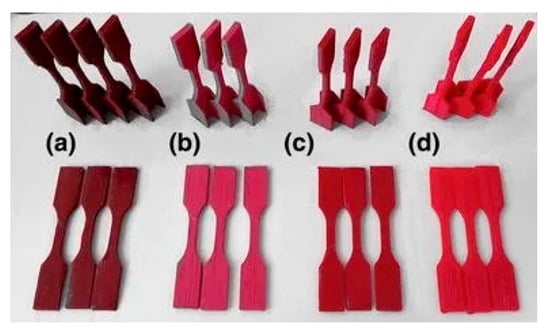 Samples (vertical above, horizontal below): (a) ABS and jute fiber, (b) ABS and TiO2, (c) ABS with thermoplastic elastomer (TPE), and (d) pure ABS. Reprinted from [43], © 2014, with permission from Springer Nature.