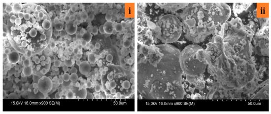 The SEM images of both fly-ash and bottom-ash are presented in Figure 1i,ii. Figure 1i shows that the fly-ash particles are spherical in shape and hence known as cenospheres (perfectly round smooth and intact) with the presence of a few irregular particles. Figure 1ii shows the bottom-ash particles that are larger in size and sub-angular to angular in shape. It also can be seen that bottom-ash particles are porous with tiny pores visible in Figure 1. This porous nature of bottom-ash causes bottom-ash to absorb more water than fly-ash [27]. This needs to be properly accounted for when using bottom-ash in GPC production since excess water might have a negative impact on the GPC properties.