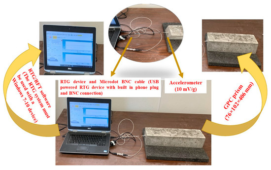 One of the objectives of this research was to calculate the RDME using an NDT called Resonant Frequency Test (RFT)/Resonant Frequency Gauge (RTG). Figure 4 shows the components of the RFT/RTG device used for this study. Firstly, an accelerometer, with a frequency response measurement range of 20,000 Hz, was attached to the GPC surface using adhesive grease. After attaching the accelerometer and positioning GPC samples to the required mode of testing, a standard ball tip hammer weighing 110 ± 2 g with a tip diameter of 10 mm, is used to strike the surface at precise locations on the samples being tested. The achieved time domain signal was amplified and passed through BNC connection/cable. Finally, Olson instruments’ RTG software records/shows the resonant frequency. ASTM C666 [37] suggested the following equation to calculate the RDME: