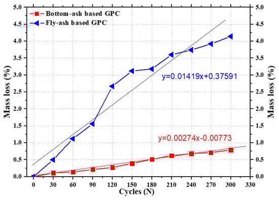 The weight of GPC was taken every 30 cycles of freeze-thaw to calculate their mass loss. Figure 5 shows the average mass loss of six fly-ash based GPC and six bottom-ash based GPC up to 300 cycles of freeze-thaw. Fly-ash based GPC shows higher and rapid mass loss possibly because the specimens’ structure failed at the early age of freeze-thaw cycles, and due to the poor bonding in the Interfacial Transition Zone (ITZ) which led to severe surface scaling. This finding is in good-agreement with the mass loss result of fly-ash based GPC-10 studied by Zhao et al. [21]. In contrast to fly-ash based GPC, the mass loss of bottom-ash based GPC was slow till 300 freeze-thaw cycles which indicates higher bonding strength of paste of bottom-ash based GPC.