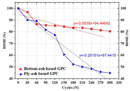 Figure 6 indicates the average RDME reduction of six fly-ash based GPC and six bottom-ash based GPC over 300 cycles of freeze-thaw. As can be seen in Figure 6, bottom-ash based GPC exhibits higher RDME than fly-ash based GPC. The RDME of both types of GPCs dramatically dropped when cycles increased from 0 to 60. Authors attribute this RDME reduction to the existence of uncured by-product particles in the microstructure of GPC that caused GPC specimens to lose its microstructural strength at early freeze-thaw cycles [55].