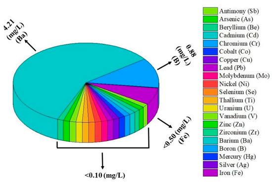 The results of the TCLP test showed that all the heavy metals could be effectively immobilized into the geopolymeric paste. Figure 7 indicates that Ba, B and Fe have the highest leaching concentration and the rest of heavy metals have a concentration of less than 0.10 mg/L. Moreover, the obtained results showed that the concentration of all the heavy metals is below the regulatory level in accordance with USEPA 1311 and USEPA CFR. This could be attributed to the cations of heavy metals (such as Cu2+, Cd2+, Fe3+, Zn2+, Pb2+, and total Cr) that can participate in the balance of the negative charge of tetra-silicate ([SiO4]4−) and potassium tetra-aluminate ([K+AlO4]4−) [57,58]. So, bottom-ash based GPC showed low porosity, which could help immobilize all the heavy metals [59,60].