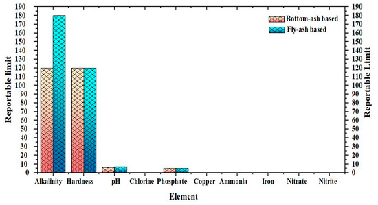 In this study, the leachability of fly-ash-based GPC and bottom-ash based GPC was measured using a water testing method called HACH strips. The water sample was collected every 30 cycles from the freeze-thaw cabinet to measure the leachability of fly-ash based GPC and bottom-ash based GPC. Since the trend of data for every 30 cycles was quite similar only results obtained from the last cycle (300 cycles) were analyzed and plotted in Figure 8. The leachability of both fly-ash based GPC and bottom-ash based GPC was constant over 300 cycles of freeze-thaw (Figure 8). This phenomenon shows that the geopolymerization process was fully completed, and all toxic metals were trapped in the paste. Moreover, heat-treatment improved the microstructure of the GPC specimens, decreased the porosity and decreased the leachability of the paste [61].