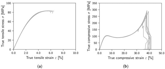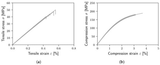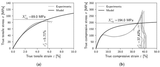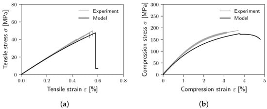 Failure initiation in the matrix is indicated by the failure criterion by Stassi-D’Alia [38] and Raghava et al. [39]. For calibration, tensile and compressive strength are needed. As the proposed nonlinear model cannot capture the stress-strain-curves of the material at higher strains perfectly, the average maximum stress values of the experimental curves ( = 82 MPa, = 262 MPa) cannot be used as strength values for the failure criterion. In tension, this would underestimate the failure strain. The compressive stress, calculated by Equation (2) using the compressive fitting parameters, asymptotically approximates a value of 225 MPa, which is quite lower than the experimental maximum compressive stress value of = 262 MPa. Thus, the modeled stresses could never reach this value. That is why “virtual“ strengths are defined to compensate for the poor fit quality in the higher strain regimes, as visualized in Figure 8. The experimentally determined average failure strains for uniaxial tension ( = 5.71%) and unaxial compression ( = 37.42%) are inserted into Equation (2) and the obtained stress values give the “virtual” strength values in tension and compression , respectively. The values are given in Table 3. After failure is indicated, all Young’s and shear moduli are set to d = 0.1% of their initial values: