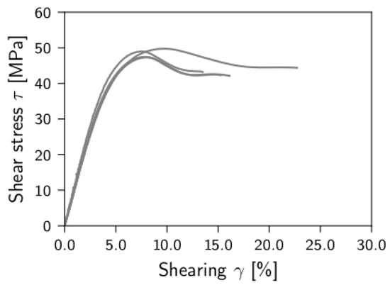The number of available specimens is six for tensile and compression tests and five for the shear test. The stress-strain-relation obtained from the uniaxial tension and compression tests of the pure resin are shown in Figure 2. The according shear test results are shown in Figure 3.