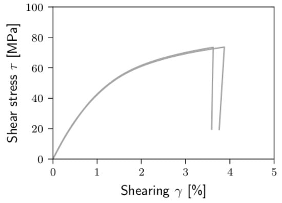 The nonlinearity parameters are set to zero. In quasi-static simulations, especially for the transverse compression and the shear load case of the FRP, the convergence rate of the numerical solver can deteriorate as soon as first damage occurs. That is why the viscous regularization scheme of Lapczyk and Hurtado [40] is adopted to the sudden degradation approach. The degradation parameter d in Equation (8) is replaced by a regularized degradation parameter . This is calculated by Equation (9).