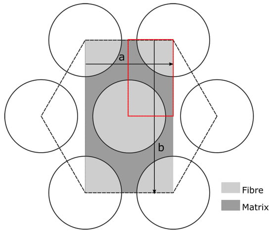 For the FEM simulations, the microstructure of the UD composite is in this work simplified to be a regular, hexagonal array despite the actually randomized fiber arrangement. This approach is used by many researchers [9,12,25,26,28]. In contrast to randomized fiber arrangements, the RVE size of regular arrangements can be chosen significantly smaller and there is no need for statistically validating the simulation results as there is no statistic variation of the geometry. Figure 6 shows a regular hexagonal fiber arrangement and the resulting RVE model with a fiber volume fraction (FVF) of 62%. Since periodic boundary conditions are applied, using the implementation by [15] (a short description is given in Appendix A), the model is not reduced to the smallest representative unit (red border). Instead, the hexagonal RVE consists of four unit cells.