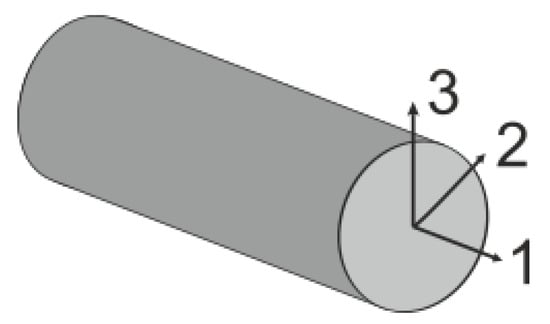 The carbon fiber behavior is considered transversely isotropic and linear-elastic until failure. The material-1-direction is defined longitudinal to the fiber, the material-2- and 3-orientations are defined transversely, as is shown in Figure 7. For failure detection, a maximum stress criterion [36] is suitable. This checks, whether the longitudinal fiber stress exceeds the tensile strength (if ) or the compressive strength (if ), respectively. As soon as fiber failure is initiated, the Young’s moduli of the fiber are reduced to 0.1% of the corresponding initial value. The material parameters are taken from [32] and are given in Table 2.