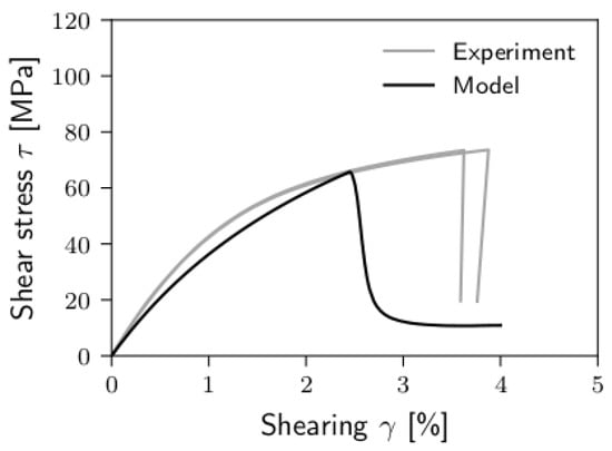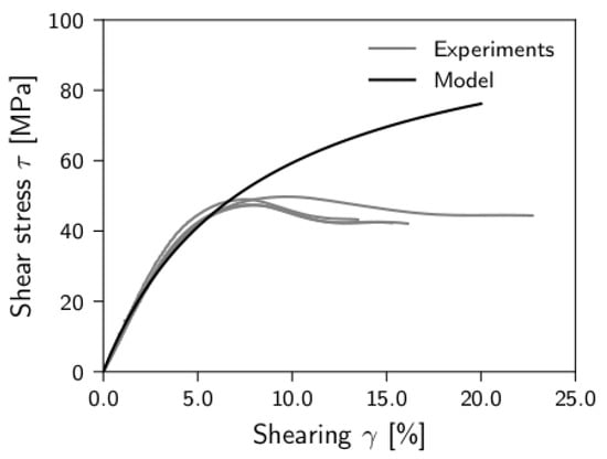 Experimentally observed and modeled (Equation (2)) stress–strain behavior of the epoxy resin under shear loading.