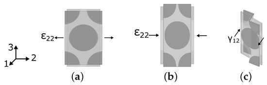Matrix-dominated load cases for the validation of micromechanical modeling: (a) transverse tension, (b) transverse compression and (c) 12-shear.