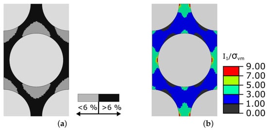 For the pure resin, the model significantly deviates from the experiments for strains higher than 6% for compression and for shearing higher than 7% for shear load, respectively (Figure 8b and Figure 9). These deviations do not affect the quality of the micromechanical simulations of the composite to a relevant extent. Figure 13a shows the local matrix strain distribution for a transverse compression load case in a composite one load increment before failure initiates. In the areas highlighted in black, the local strain component in the direction of the external load exceeds 6%. This is the case for about half of the matrix area. Due to the error of the pure resin model, a significant overestimation of the stresses in the black highlighted areas could be suspected. Due to the extent of these areas, this should lead to a significant overestimation of the effective composite stresses. This is, however, not observed (Figure 11b). To find an explanation, Figure 13b shows the local stress distributions in terms of the ratio of the first stress invariant to the von Mises equivalent stress . The first invariant gives the dilatoric part or hydrostatic pressure p (p) of a stress state. The von Mises equivalent stress is a measure for the deviatoric part. For a uniaxially stressed homogeneous material, the first invariant and the von Mises equivalent stress are equal. For multiaxial stress states, as found in the matrix in a composite under transverse compression load, the hydrostatic pressure is much higher than the deviatoric part. Only in a few areas of the matrix (highlighted in black in Figure 13b) the equivalent stress according to von Mises is equal to or greater than the first invariant. The plastic behavior of the epoxy resin, which is often assumed to alone cause the nonlinear matrix material behavior, depends on the hydrostatic pressure component of the stress state [21,29]. Higher hydrostatic pressure raises the yield point of the material. So, although plastic flow occurs in the epoxy resin under uniaxial compressive loading from a certain strain, in the composite, this is delayed by the higher hydrostatic stress component. Thus, local plasticity of the matrix seems to be less relevant for the global composite stress–strain behavior.