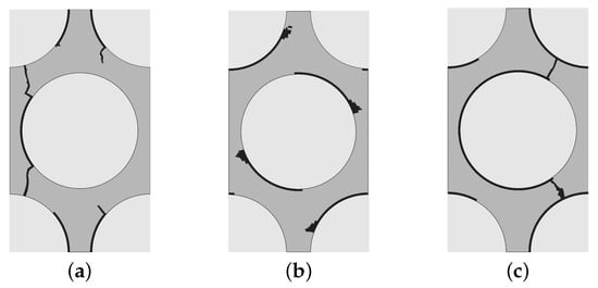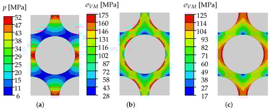 As the interface is modeled to be a perfect connection of fiber and matrix, damage occurs only within the matrix phase. Strictly speaking, there is no interface failure in the model. Nevertheless, the failure of the matrix elements being directly connected to the fiber elements is referenced to “interface damage’‘ or “debonding“, in the following. The contour plots in Figure 15 explain why the damage initiates at the fiber-matrix-interface. The plots show the matrix stress distribution within the transversally loaded UD composite one load increment before damage initiates. The matrix failure behavior is pressure-dependent: The higher the amount of a negative dilatoric stress (hydrostatic pressure p < 0), the higher the bearable amount of the deviatoric stress part, represented by . Thus, for stress states with positive dilatoric stresses (p ≥ 0), these dominate the matrix failure. For stress states with negative dilatoric stresses, the failure becomes deviatorically dominated. Figure 15a shows the dilatoric matrix stress distribution in the composite under transverse tensile load. The dilatoric stresses are positive over the whole RVE. The opposite is true for the other load cases: Under transverse compression, mainly negative hydrostatic matrix stresses are present and under shear the hydrostatic stress proportion is negligibly small. Therefore, Figure 15b,c show the distribution of the von Mises equivalent stress as this dominates the matrix failure for these load cases. Due to the property mismatch of fiber and matrix, stress concentrations (red areas) arise in these regions for all load cases. Within these red areas, the damage initiates in the matrix elements which are directly connected to the fibers. Due to the introduced local scatter of the matrix strength, the damage is not initiated in all (red) areas with stress concentration but only in the elements with a critical combination of high stresses and small strength.