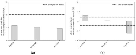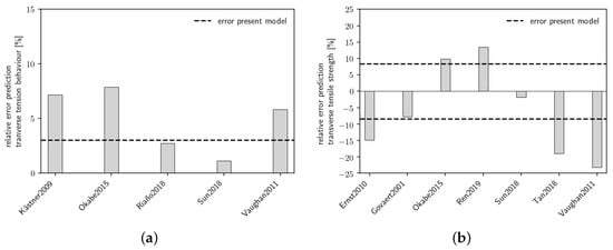 After the error of the model prediction has been assessed, the prediction quality is compared to similar models found in the literature. For this comparison, published micromechanical simulation results based on different material modeling approaches are selected that have also been compared to experimental data. As the present paper is not a review, this model selection does not claim completeness. Most of the selected models use an elasto-plastic [7,9,10,11] or visco-plastic [12,13,27,28] modeling approach for the pure resin material. Two micromechanical simulations based on a linear-elastic and isotropic material model of the matrix are represented [14,23]. The cited micromechanical approaches also differ concerning the modeled fiber arrangement and the interface modeling. Table 5 provides the key aspects of the micromechanical modeling approach for each selected model.