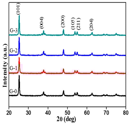 XRD Patterns of pure TiO2 (G-0) and Cu-doped TiO2 (G-1, G-2, and G-3).